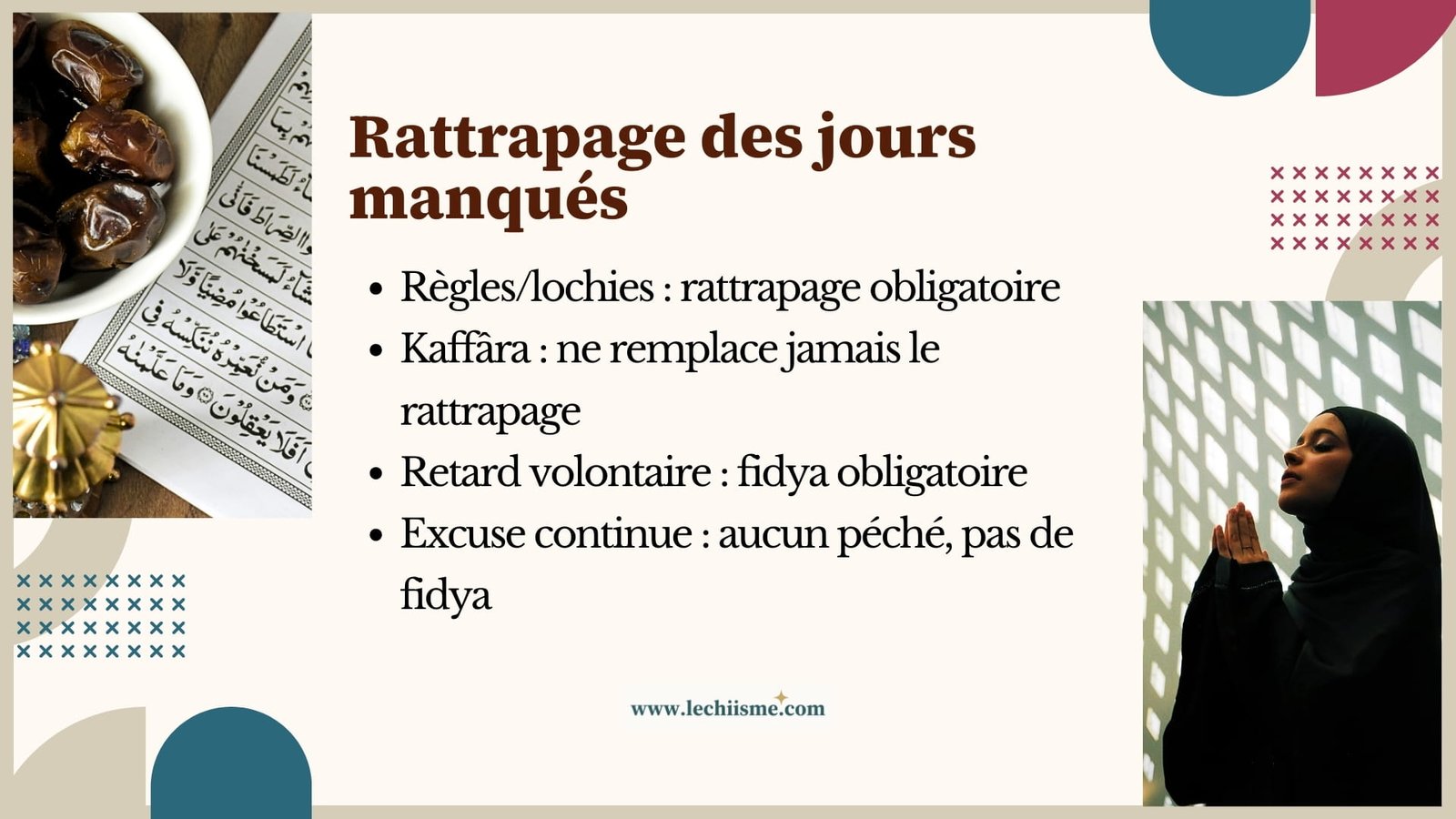 L’expiation (kaffāra) ne remplace jamais le rattrapage (qaḍāʾ), et le rattrapage des jours de jeûne manqués demeure obligatoire en toute circonstance.