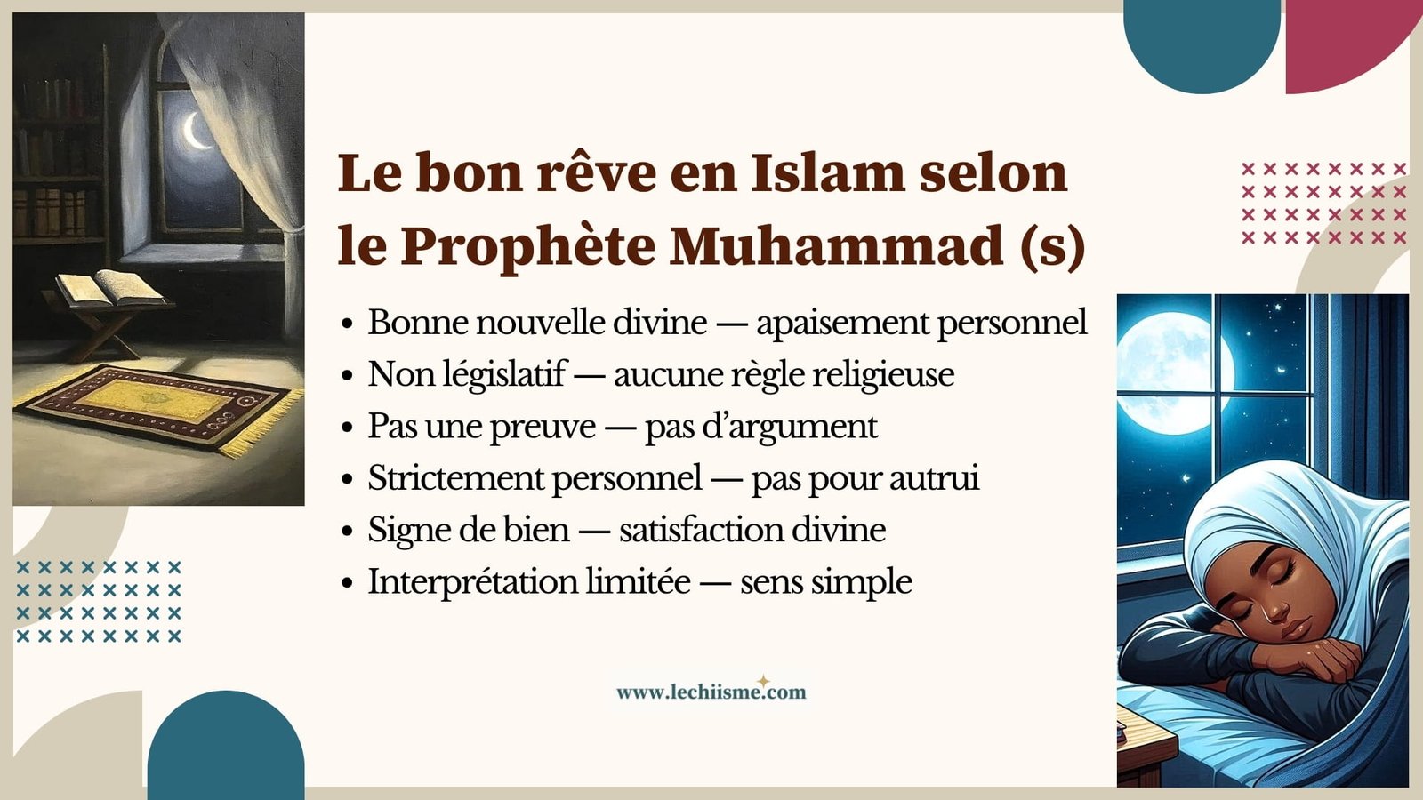 Ces séances permettent d’aborder les rêves avec discernement, en les replaçant dans leur juste cadre, à la lumière de l’intellect, du Coran et des hadiths authentiques.